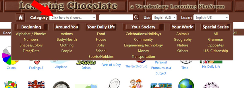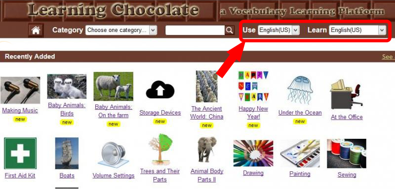 A: At the top of the right hand screen there are 2 boxes for you to set your language choice. The USE box should be set to your own native language, or the language you want to have the instructions and headings displayed in. For example, if you click on Spanish, the category headings will appear in Spanish. The LEARN box is the language you wish to learn by using the word sets.