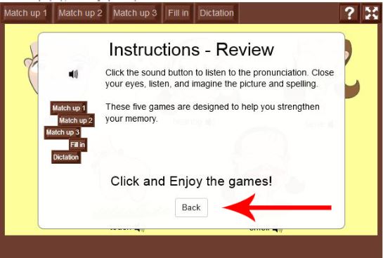 After reviewing all of the words, you have a choice of 5 interactive games that are designed to help test and strengthen your memory.