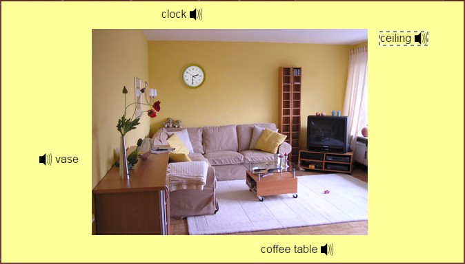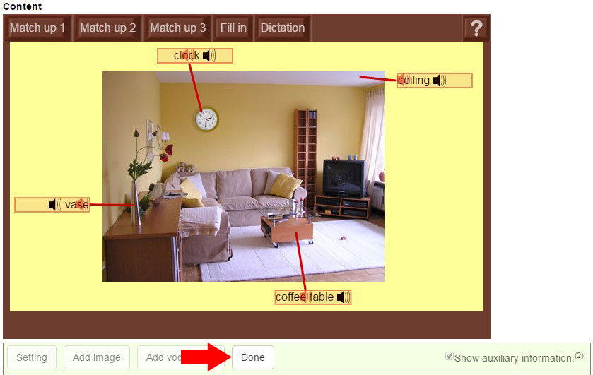 To draw the first line, press and hold a start point near to the red sound icon of vocabulary "ceiling": don’t release it! Move the cursor to the object of the ceiling. Once you have drawn the line, release. You can draw the other 3 lines in the same way as in Figure 12. When you have finished adding all the lines, click “Done”.