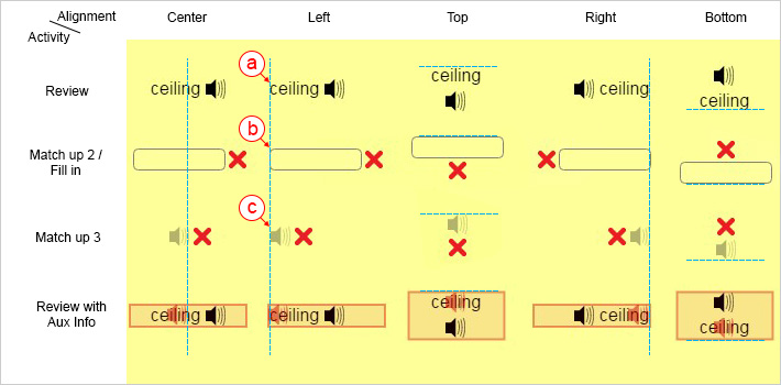 Figure 7 shows the effect of different alignments. The alignment here means an invisible line (the blue line shown) which the word aligns to in the different games. For example, for “ceiling”, if we set it as ‘left’ alignment, the word (Figure 7a), the fill-in box (Figure 7b), and the gray sound icon (Figure 7c) will all be aligned to the left for the Review, Match Up 2/Fill In, and Match Up 3 games.