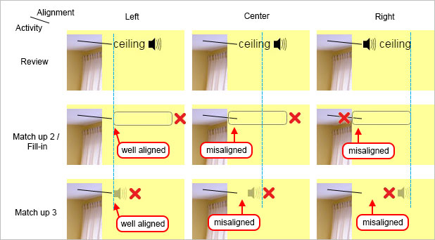 Since the width of vocabulary, fill-in box and sound icon are different, correct alignment should be set so that they show up in a good location on the screen when users play ALL the games. Figure 8 shows the effect of different alignments.